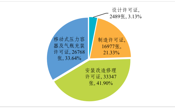 截至2024年年底,全国共有特种设备生产(含设计、制造、安装、改造、修理)和充装单位76450家,持有许可证79581张,其中:设计许可证2489张,制造许可证16977张,安装改造修理许可证33347张,移动式压力容器及气瓶充装许可证26768张(见图2)。